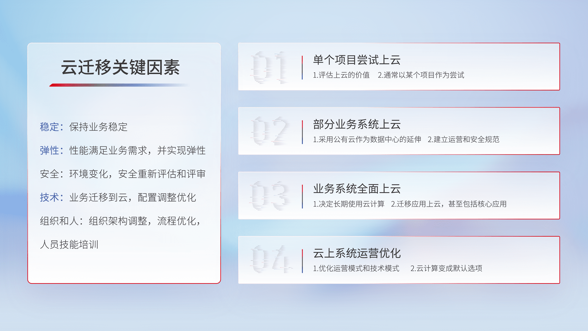 结合实际业务,,,从规划设计、、、、云平台选型、、、云原生改造、、、、数据迁移、、、、集成交付,,,迁移全过程为客户识别最佳上云路径,,,做好风险识别管理,,,,设计网络架构、、、、身份权限、、、、安全审计合规、、操作审计、、、日志审计、、、、监控告警策略、、、多站点容灾设计等,,,,对云上基础设施进行整体规划,,,提升IT治理水平,,以满足弹性、、、高可用、、、高性能的需求。。。。