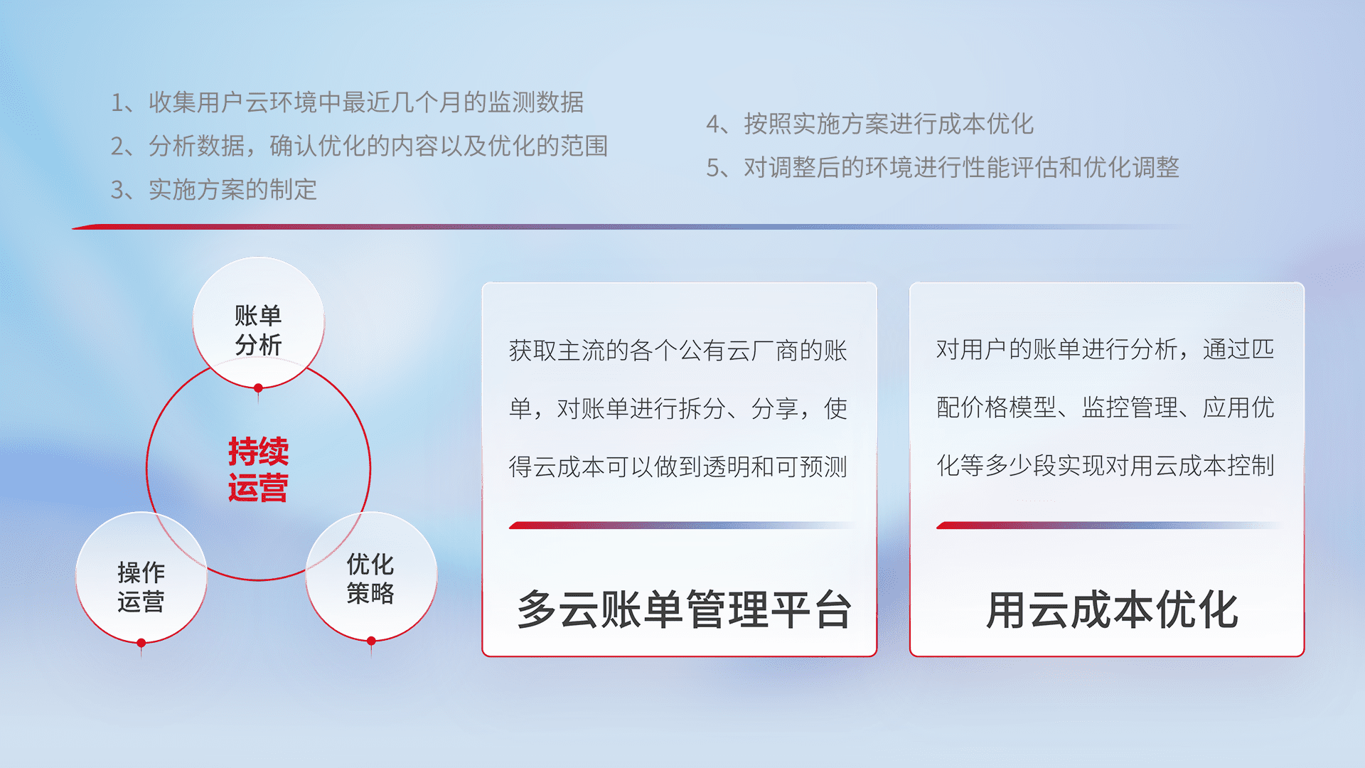 通过多云纳管,,以统一的资源数据模型把客户的云资源进行抽象和封装,,,,进而实现对多云资源的统一操作,,,,保障云资源管理的可靠性、、、稳定性与可用性。。量身定制化运维内容,,,配置、、、、开发运维、、、、补丁管理、、、备份、、、、监控、、、认证和访问管理、、、审计和日常巡检等,,,,保障在用云过程中的可靠度,,,稳定度以及高可用率。。。。